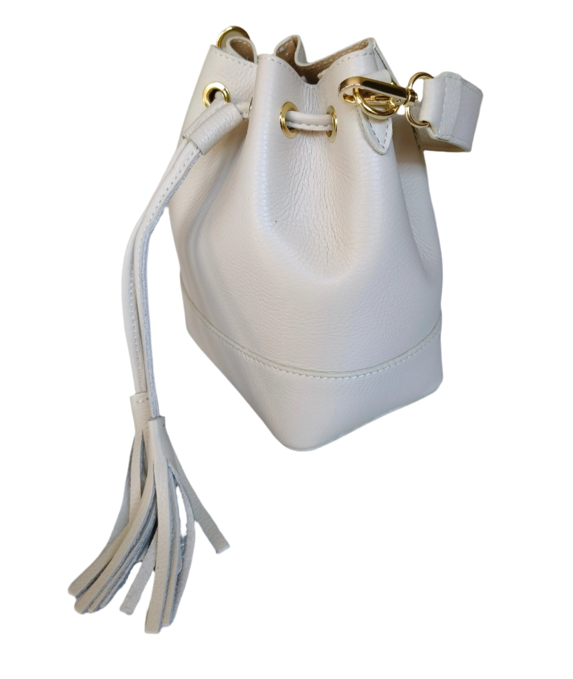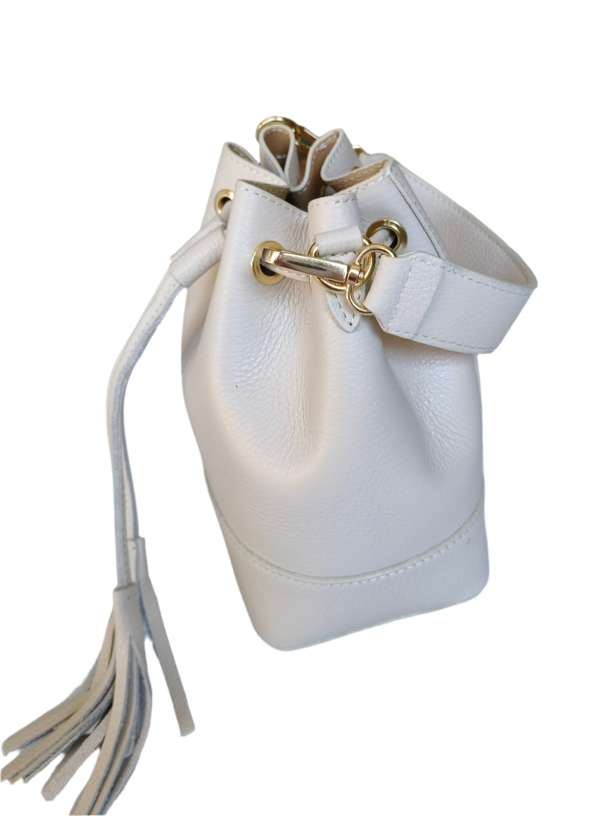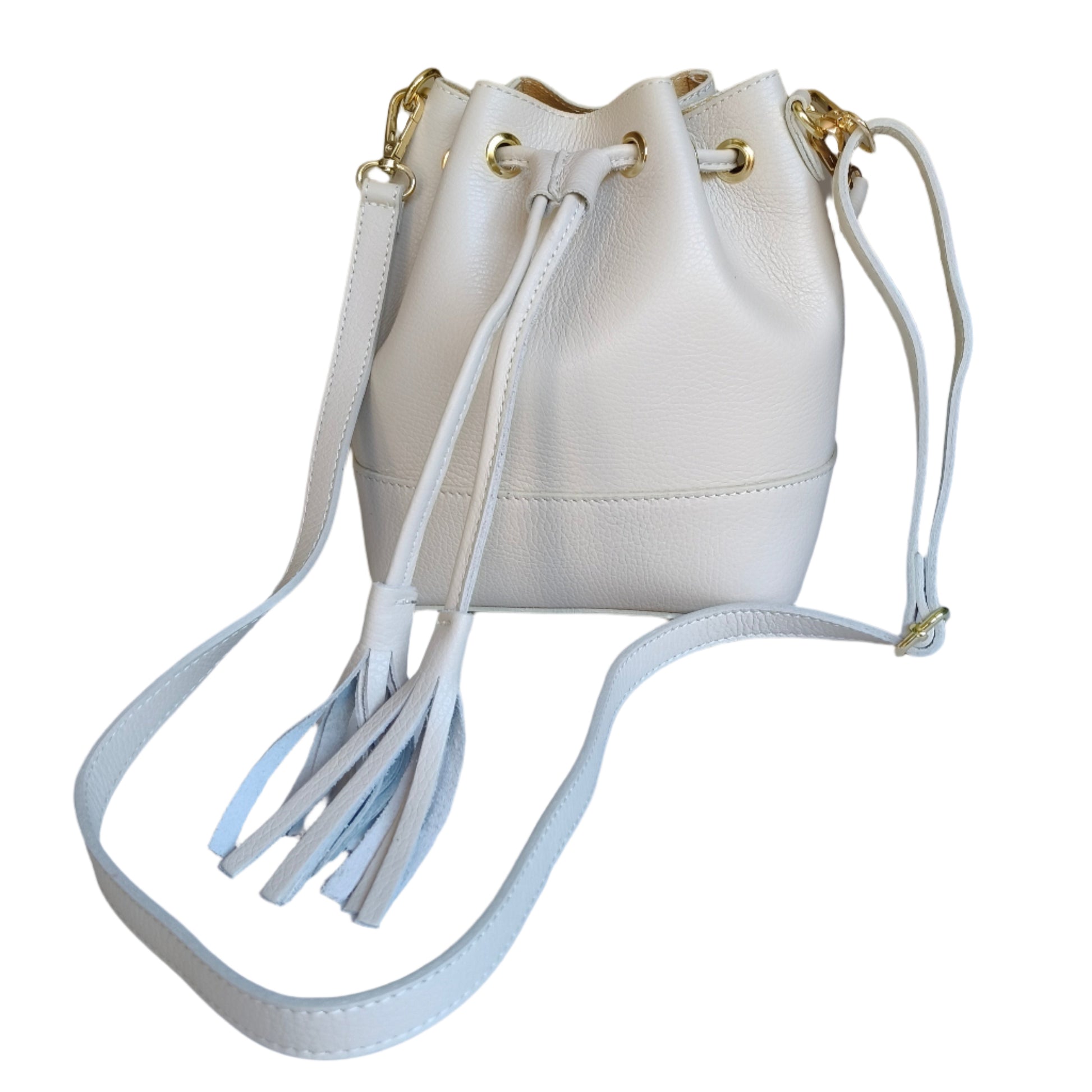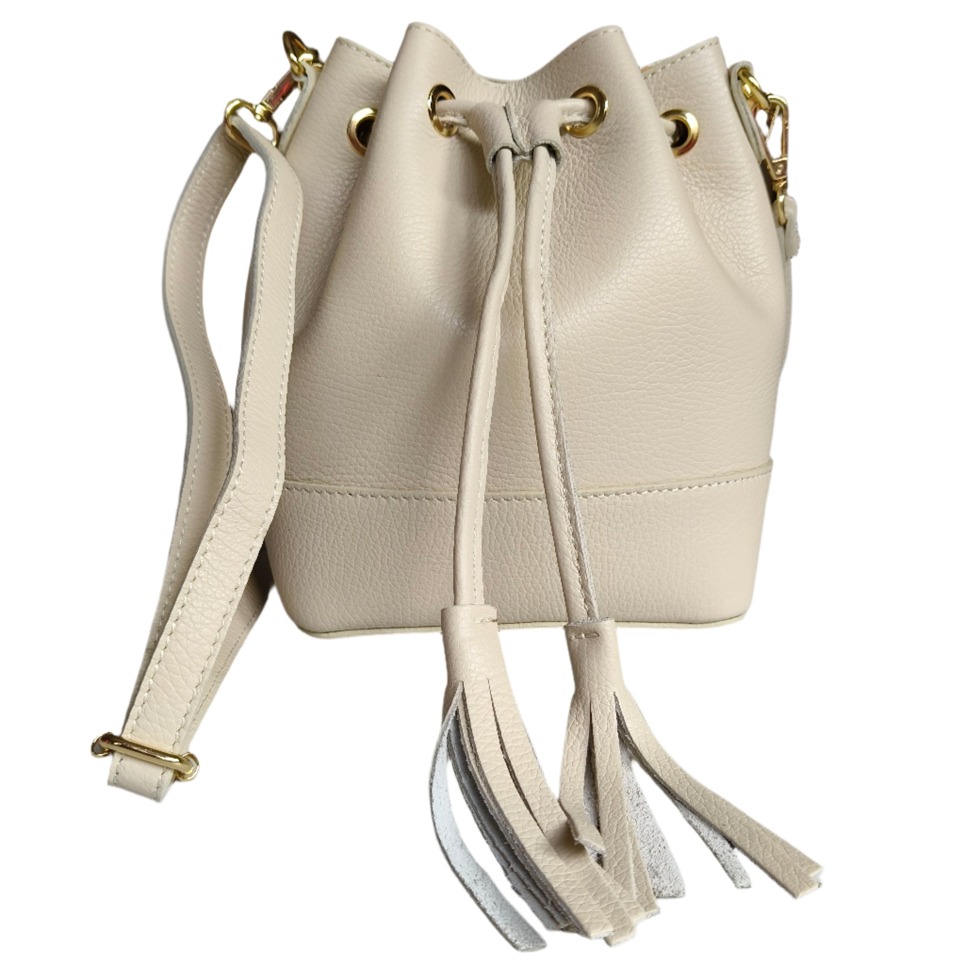 Expertly crafted in Italy, our Cream Leather Bucket Bag is a must-have accessory.