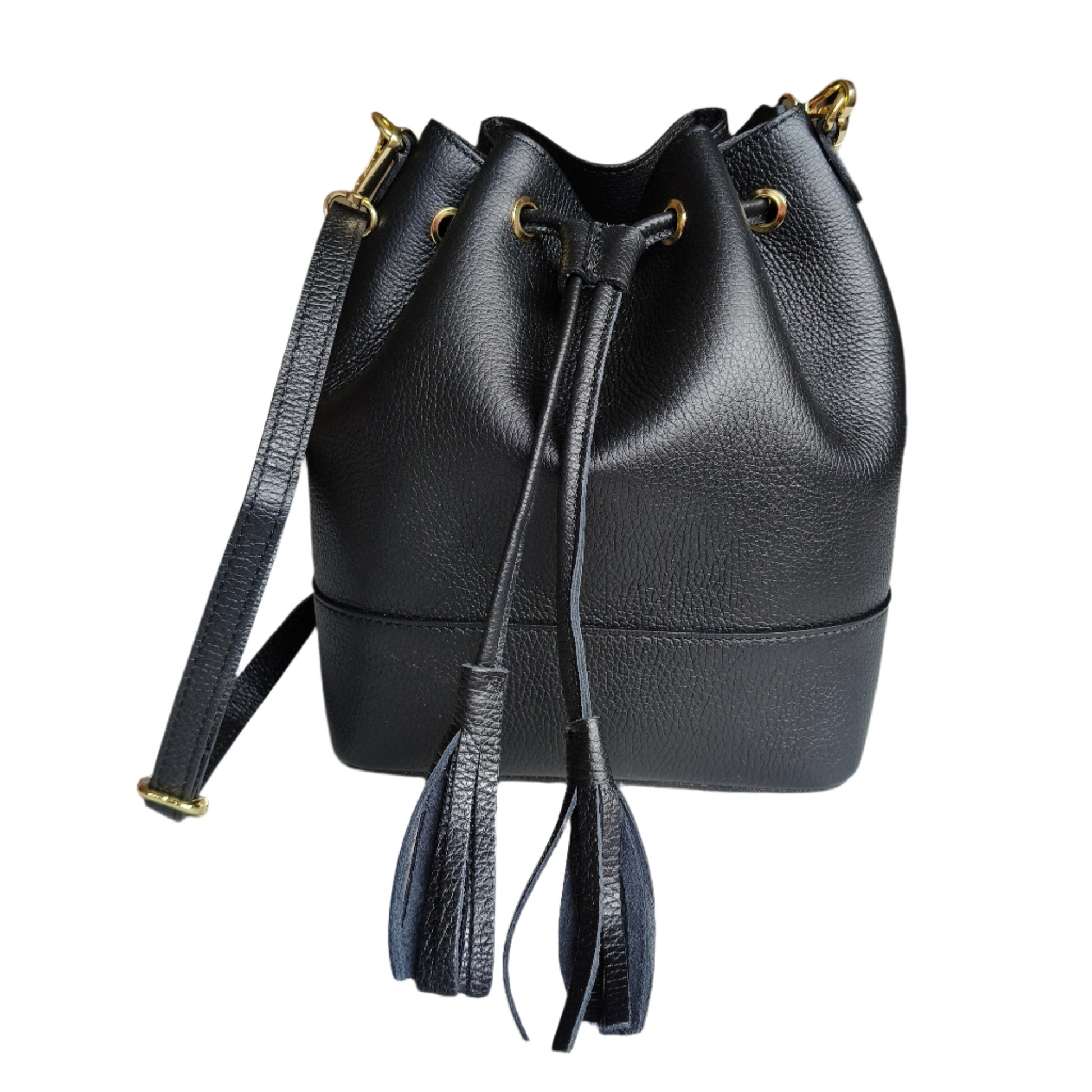 Expertly crafted in Italy, our Black Leather Bucket Bag is a must-have accessory.