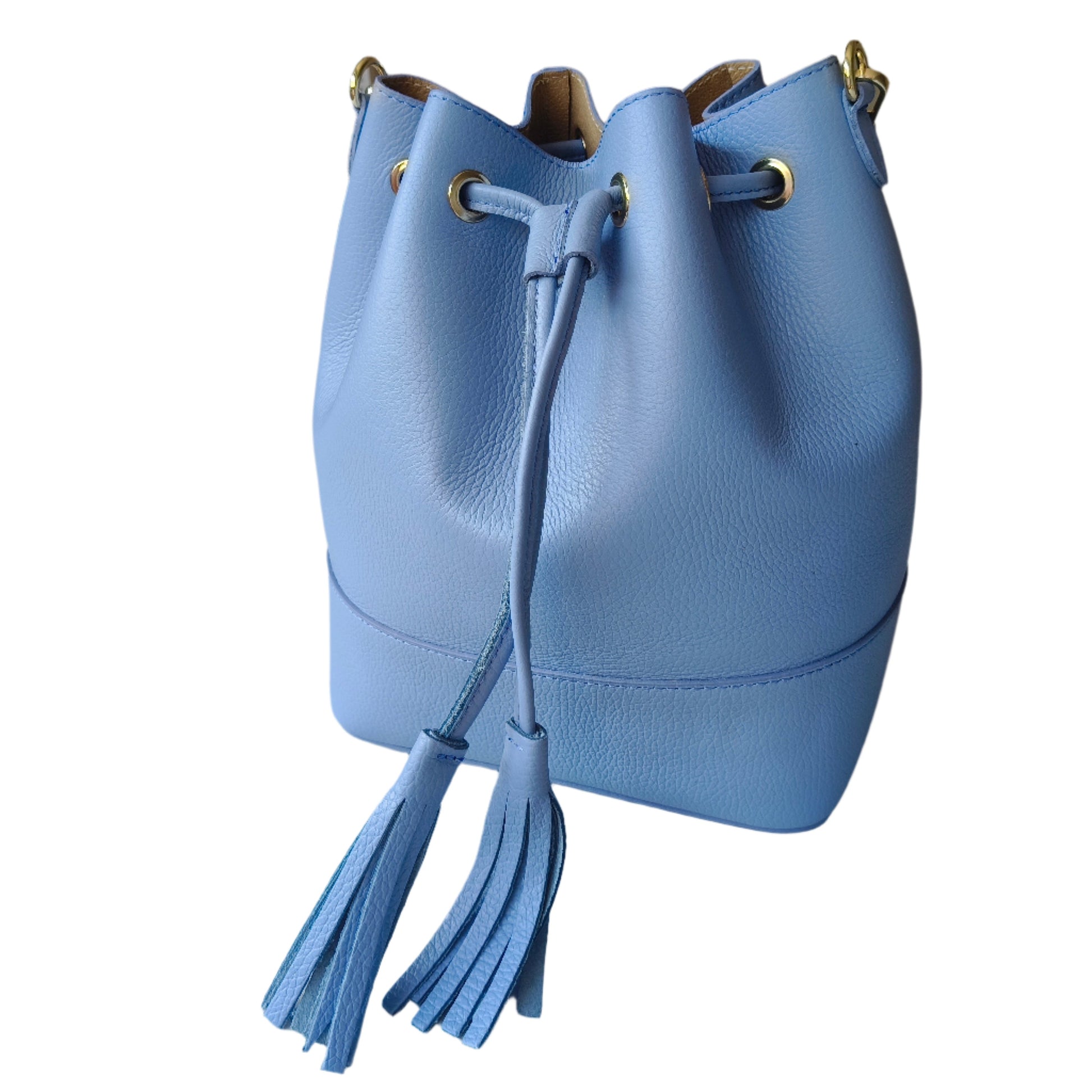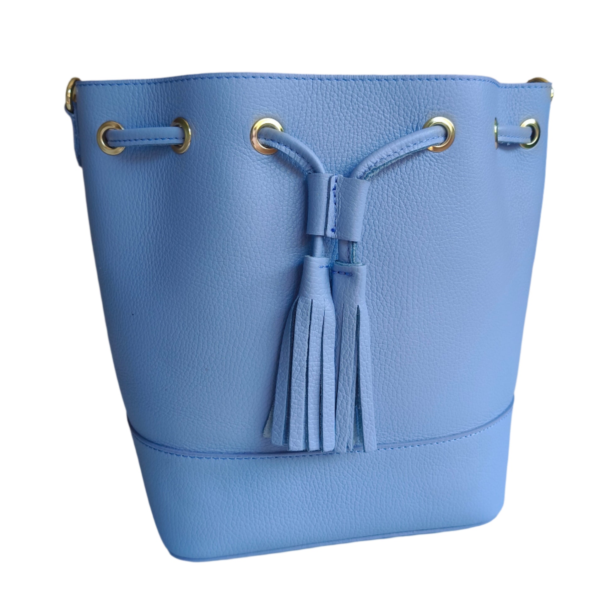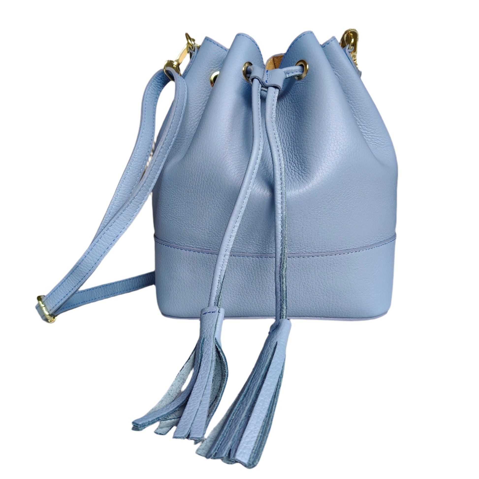 Expertly crafted in Italy, our Baby Blue Leather Bucket Bag is a must-have accessory.