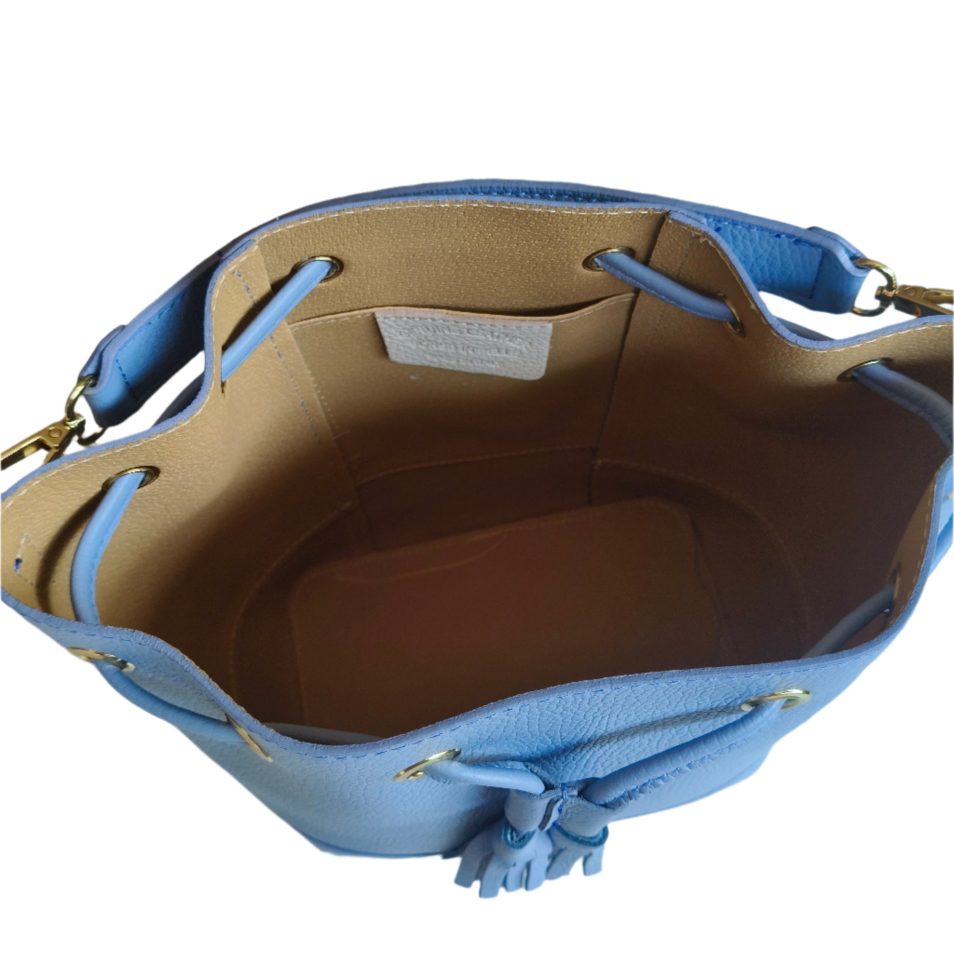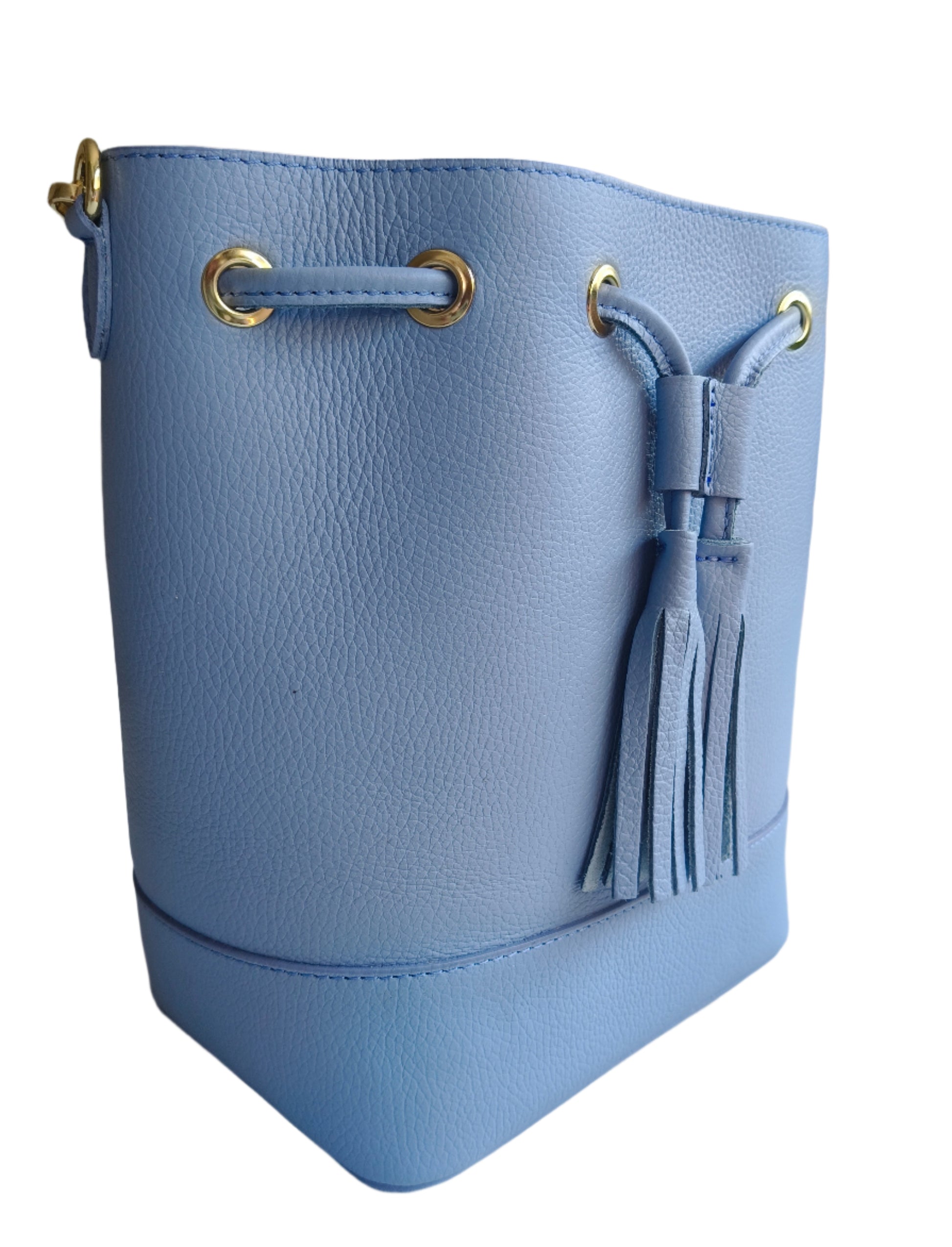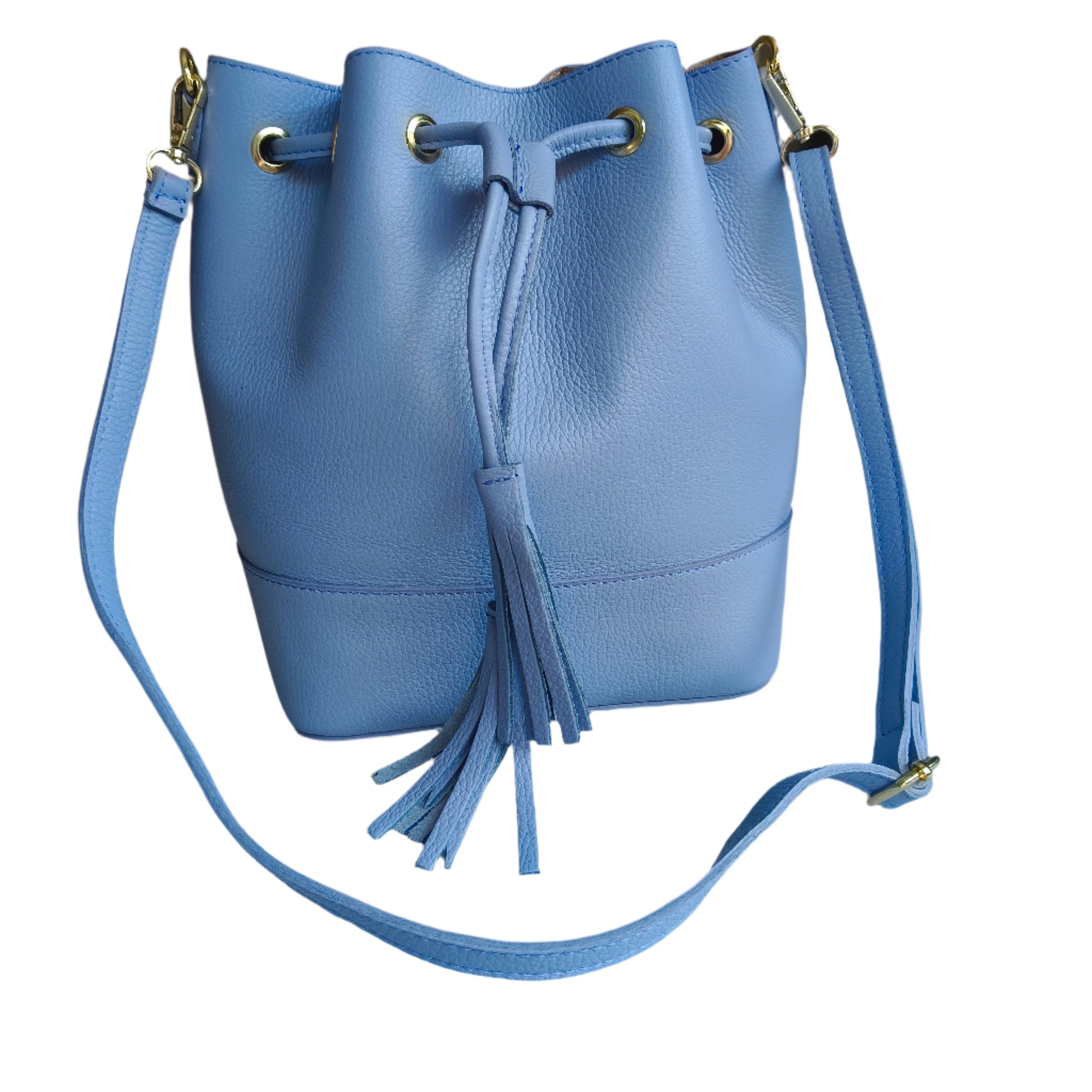 Expertly crafted in Italy, our Baby Blue Leather Bucket Bag is a must-have accessory.