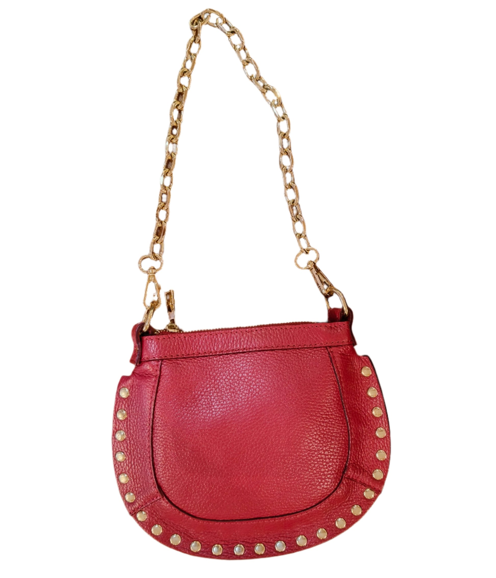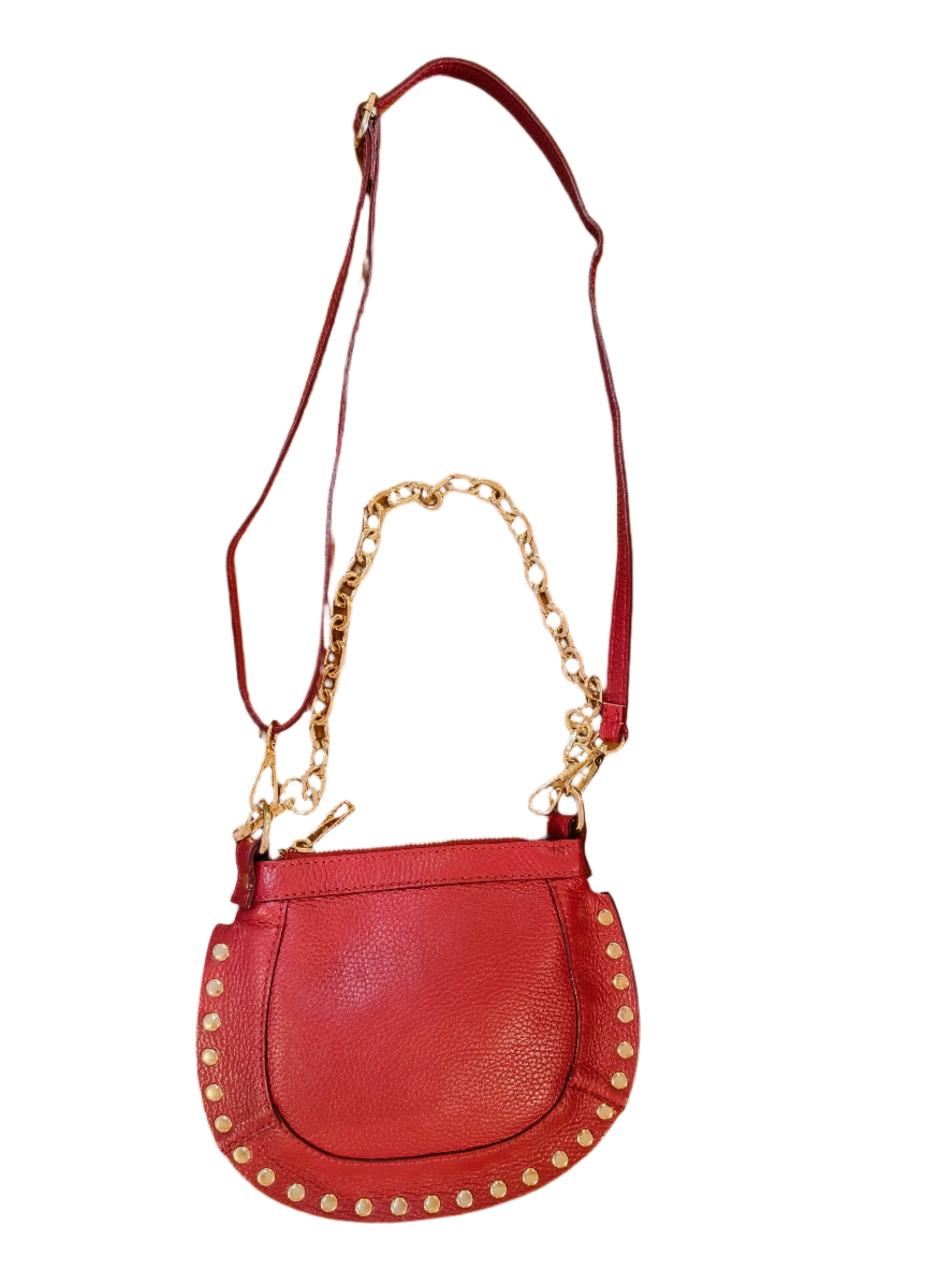 This Red studded cross body bag boasts a sleek and edgy design, featuring a chain strap for added style.